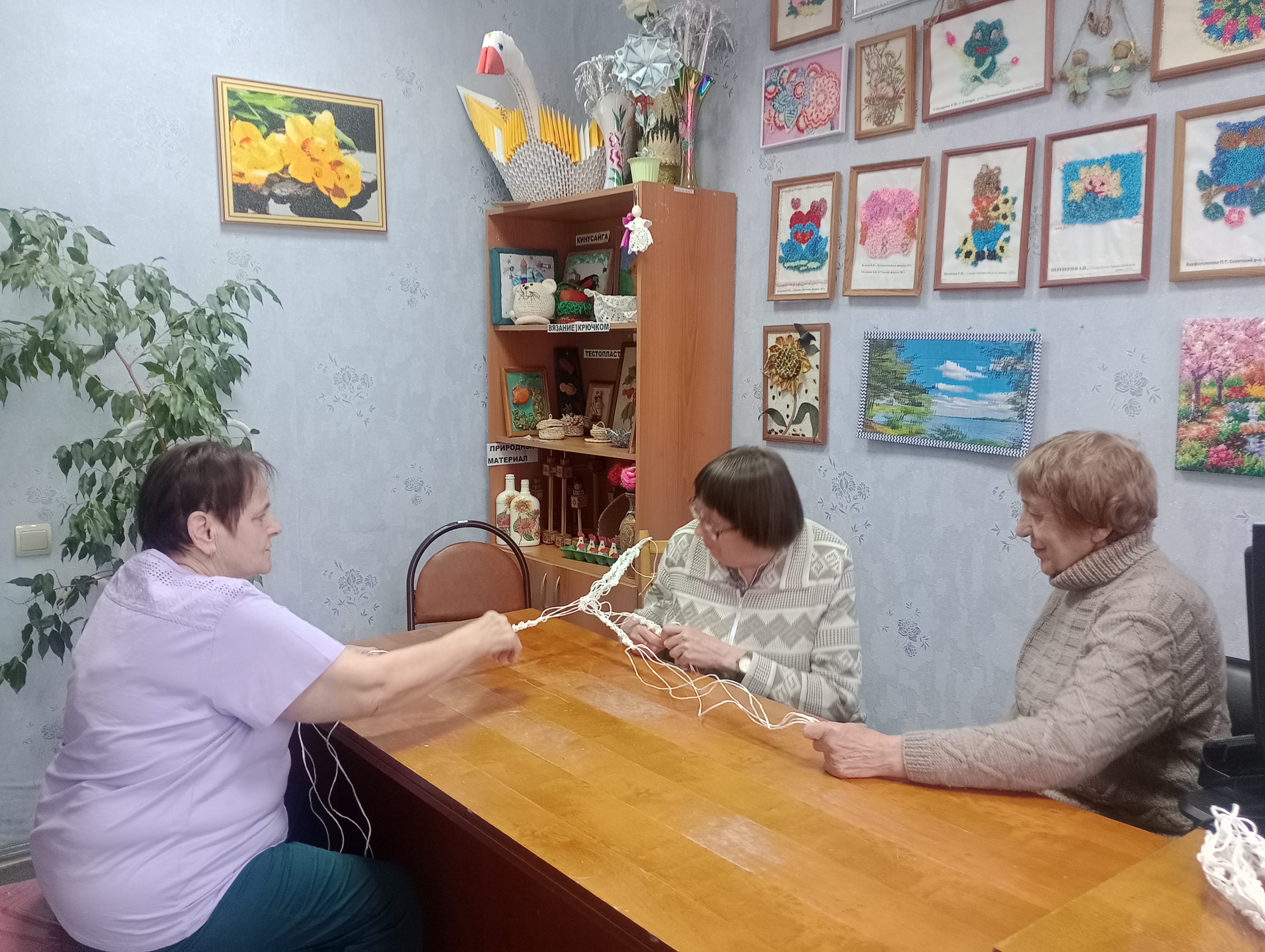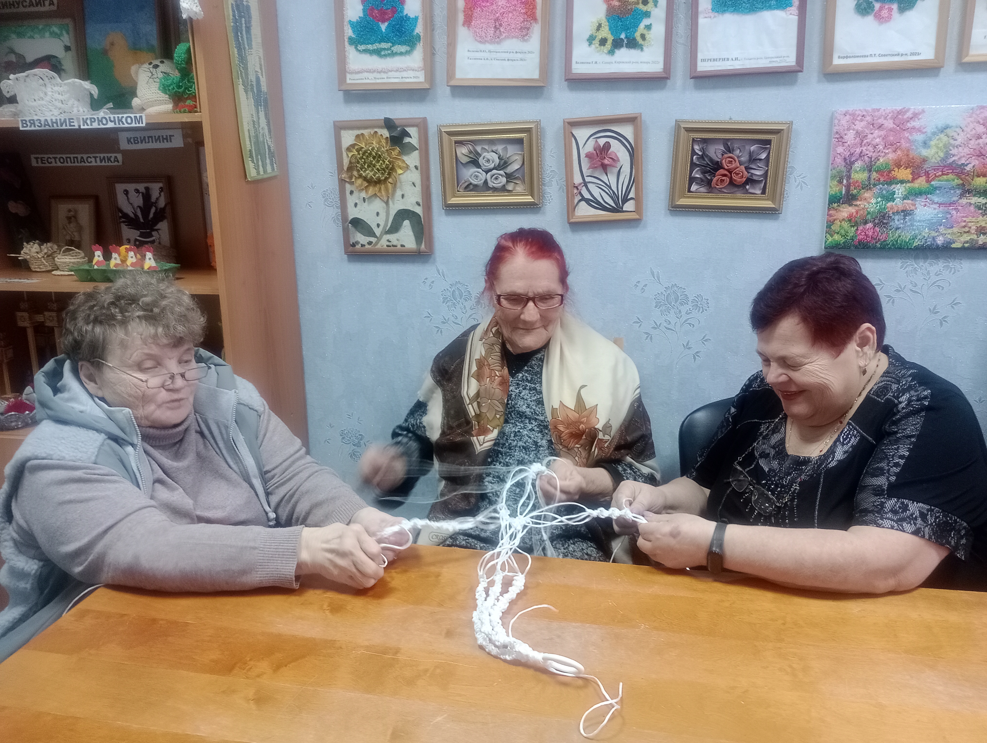 Получатели социальных услуг с удовольствием осваивают новую для них технику. Внимательно слушая руководителя, связывают в узелки джутовый шпагат, наблюдая, как из переплетений нити начинают появляться симметричные узоры, следом и готовое изделие, выполненное своими руками.
