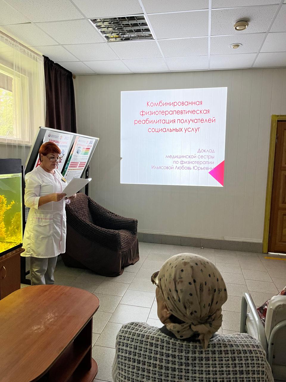 В рамках социально-медицинского консультирования в стационарном отделении РЦ «Доблесть» медицинская сестра по физиотерапии Ильясова Л.Ю. прочитала лекцию: «Комбинированная физиотерапевтическая реабилитация для получателей социальных услуг».
